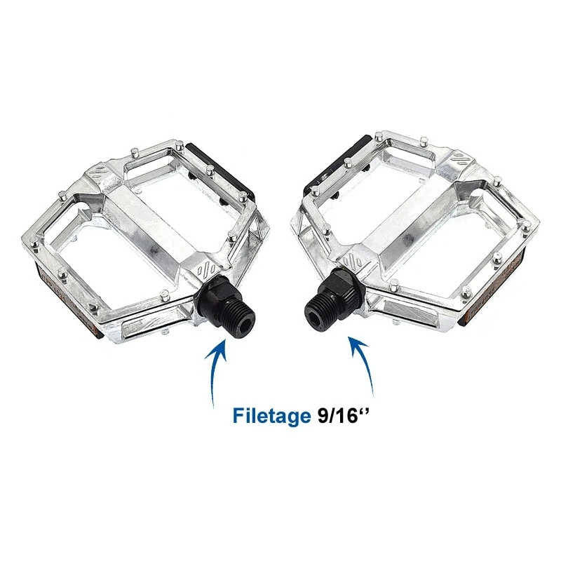 Ces pédales large en avec corps en aluminium sont recouvertes de picots moulés afin que les pieds ne glissent pas par temps pluvieux ou lors des traversées en sous bois dans les endroits boueux. Compatible pour la majorité des vélos de type VTT et VTC disposant d’un filetage de 9/16 ». Côté sécurité, les pédales sont équipés de catadioptres pour être vues par les automobilistes à l’avant et l’arrière du vélo.