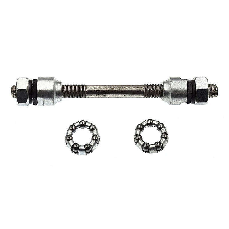 Cet axe en acier argenté de 127 mm permet de fixer la roue avant du vélo, celui est livré avec 2 cages à billes.