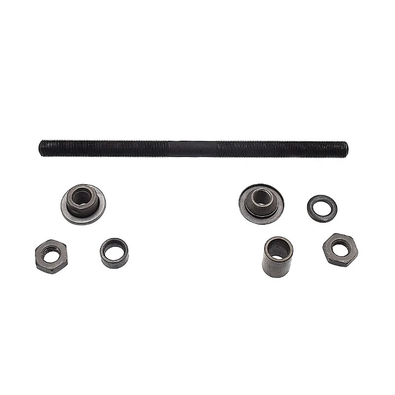 L’axe est fourni avec 2 entretoises, 1 rondelle, 2 coupelles et 2 écrous ainsi que 2 cages de 7 billes permettant une parfaite rotation dans le moyeu de la roue.